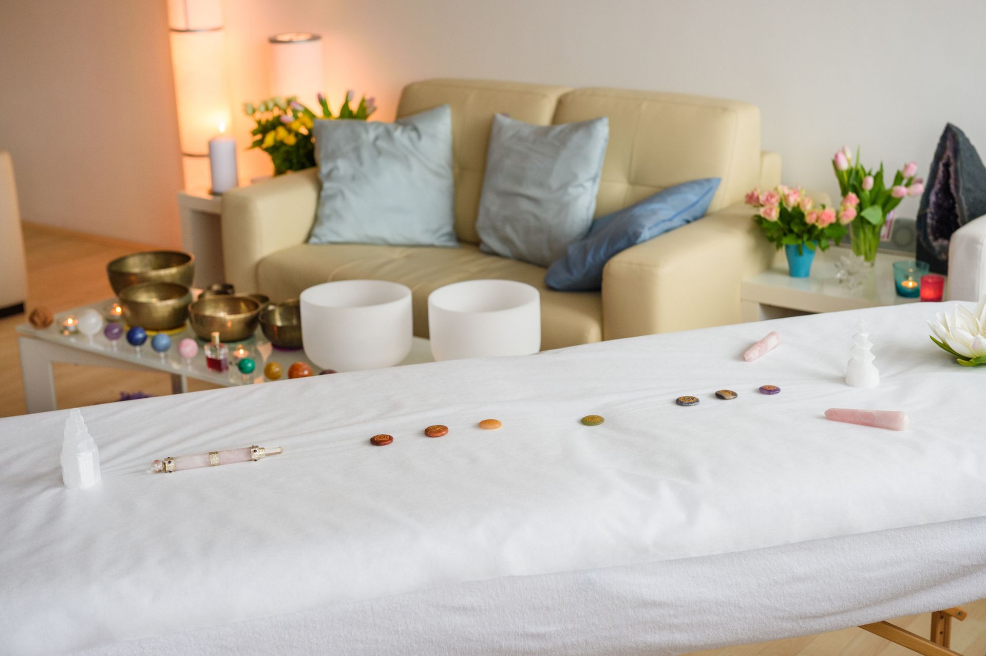 Sound healing utilizes frequencies from singing bowls, tuning forks, and other instruments to create vibrational healing that affects the body at cellular levels. The movement of sound waves through the body can calm the nervous system and promote deep relaxation.